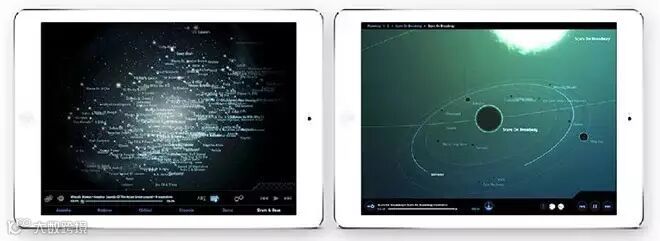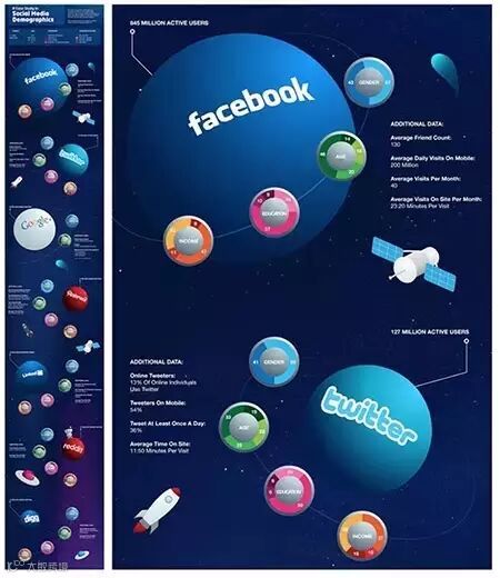 Social Media Demographics:这是一份关于社交媒体网站的用户分析报告,将各个网站比喻成星球,活跃用户数越多,则体积越大;并用环绕的行星表示用户性别、年龄等的比例构成。通过设计营造出星系的场景感,极具故事性而且更加吸引人。