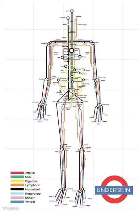 Underskin:将人体内部的血液循环系统比作地铁路线图,线路中的站点就是人体的主要器官。血液的不停流动,物质之间的交换,这和地铁中循环运转的列车,站点之间的转换确实有某些类似之处。