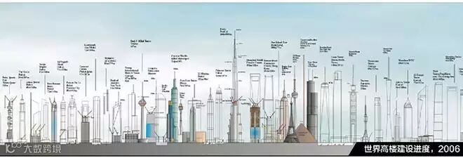 世界高楼建设进度(2006):图中将世界各个著名的高楼放在同一画面中来做比较,不仅能明显看出它们之间高度的差异,作者更要表达的是这些高楼目前的建设进度,通过将高楼建成的部分进行上色,而未建成的部分用线条勾勒,来进行自身差异化的表现。