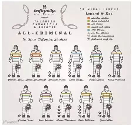 All Criminal:介绍犯罪大全的图示,巧妙地与囚服相结合,让读者一眼就能明白主题与犯罪相关;通过囚服条纹地色相变化来区别犯罪的种类和程度,并且对比明显,让人印象深刻。