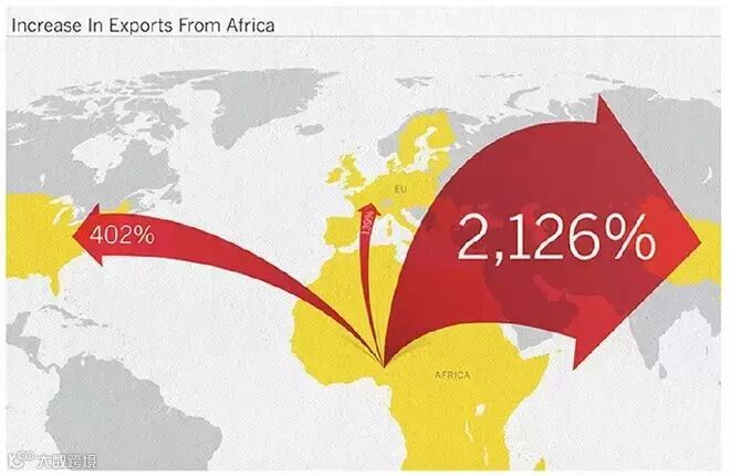 Increase In Exports From Africa:箭头的使用不但能表现出方向性,并且能让静止的图片产生动感。图中通过箭头的方向表示非洲出口的目标国,并且通过箭头的大小对比来表现不同的出口增长率。