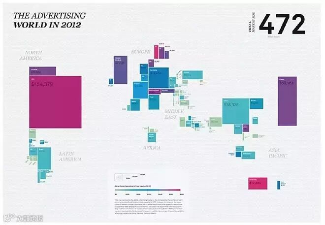 The Advertising World In 2012:如何在较小的空间表现差值较大的数据?可以将一维的数据用面积或者体积来表现;图中关于世界各国广告的花费,作者将费用换成面积并结合地理位置表现,很好的避免了空间不够的尴尬。