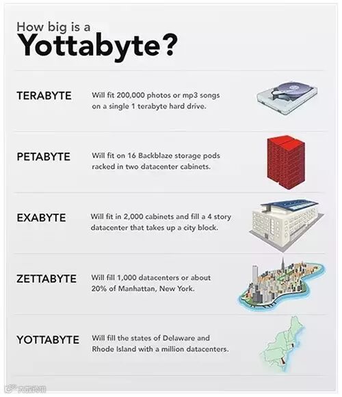 How Big Is A Yottabyte?:关于计算机不同字节的大小对比,如果按字节的定义,即使通过柱形图对比表现出来,依然无法让人直观感受;图中将不同的字节容量描述称可以存储的具体数据(图片、音乐……),以及存储这些数据需要的实体空间,非常形象具体。
