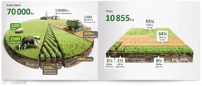 农场信息图表:一组土地资源储备的构成比例图,通过结合极具写实感的图片,构建了一个生动的土地和农场的真实场景,极具想像空间。