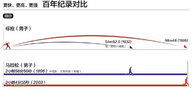 百年纪录对比:马拉松这类花时间越少,成绩越优秀的项目,如果用常规的柱状图绘制,那么明明最快的成绩却看上去感觉最慢。这张图中将最快的记录用100%表示,然后以此为基准,画出不同参赛者的相对位置,让人一目了然。
