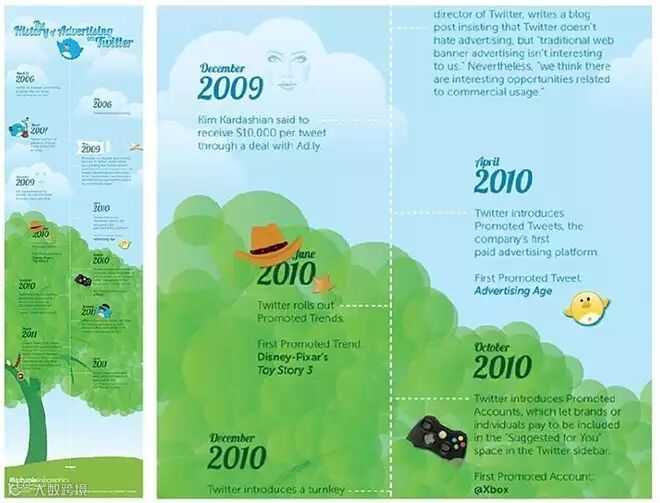 The History Of Advertising On Twitter:关于Twitter广告历史的信息图,按照时间轴的顺序排列数据,有意思的是通过插画,营造了一个蓝天白云的场景,不论是关联性上还是色彩的运用都非常贴合Twitter的品牌特征。