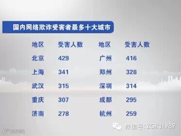 据统计,今年上半年,北京的网络欺诈受害者为429人,广州416人,上海341人,郑州328人,武汉315人,深圳314人,重庆307人,成都295人,济南278人,杭州259人。上述地区被列为国内网络欺诈受害者最多的十大城市。