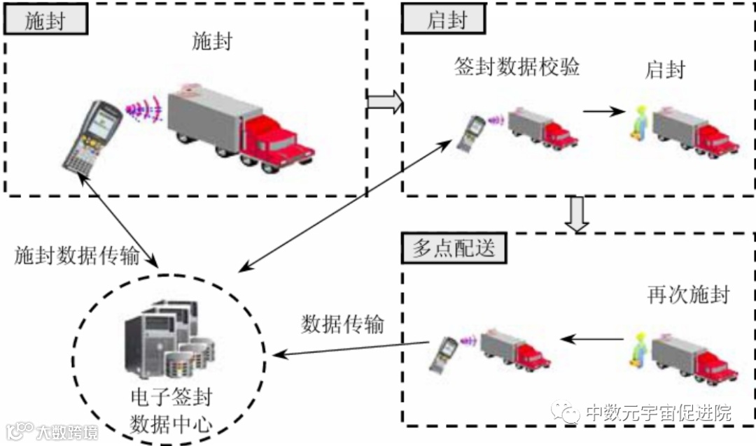 借助物联网RFID技术对食品运输车辆的运输过程进行封闭管理,在车辆发出和达到两个节点分别进行施封和启封,两个操作环节的数据均实时上报数据管理中心,通过电子签封本身的唯一性和前后数据对比保证运输过程中车辆厢体未被开启和数据未被篡改。