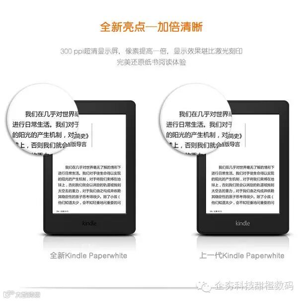 亚马逊16日正式发布第三代Kindle Paperwhite电子墨水屏阅读器。相较于去年6月份推出的 第二代产品,第三代Kindle Paperwhite终于把像素密度提升了一倍,现在已经达到了与Kindle Voyage相同的300PPI,也就 是视网膜屏幕级别,屏幕尺寸则没有变化,依旧为6英寸。