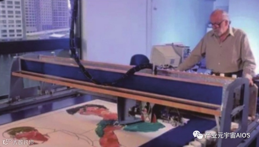 AI作画的历史要追溯到1973年,加利福尼亚大学教授哈罗德·科恩(Harold Cohen)开发了首个利用机械臂作画的AI艺术家(图1-5展示了AARON和哈罗德的创作过程),他的概念是建立一个拥有自己的行为模式的人工智能艺术家。