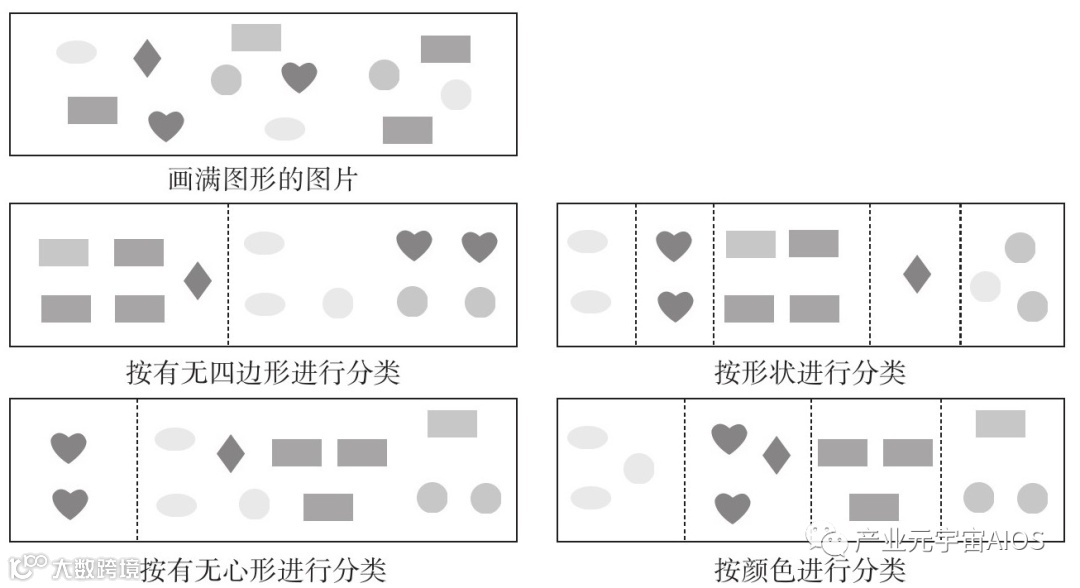 如果对画上的形状进行分类,可以按照形状这种属性分类,分为长方形、心形、椭圆形、圆形、菱形,也可以按照颜色这种属性分类,分为红色、绿色、蓝色、粉色。