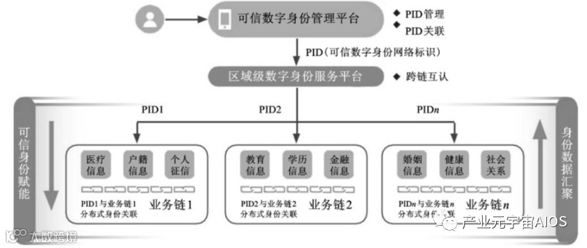 可信数字身份管理平台通过对各个业务链内的不同PID\进行关联,支持对不同生态链之间同一用户的身份进行关联。