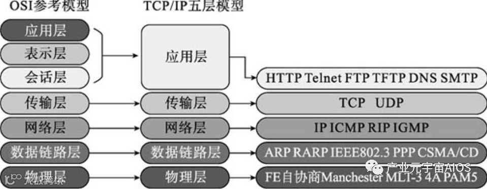 TCP/IP 协议作为当前互联网的事实标准,本身是 ISO(国际标准化组织)于 1985 年制定的网络互联参考模型 OSI(Open System Interconnect,开放式系统互联通信)的简化版,它不仅仅指的是 TCP 和 IP 两个协议,而是一系列协议构成的协议簇,这些协议分布在五层的体系结构中,如图 5-2 所示。