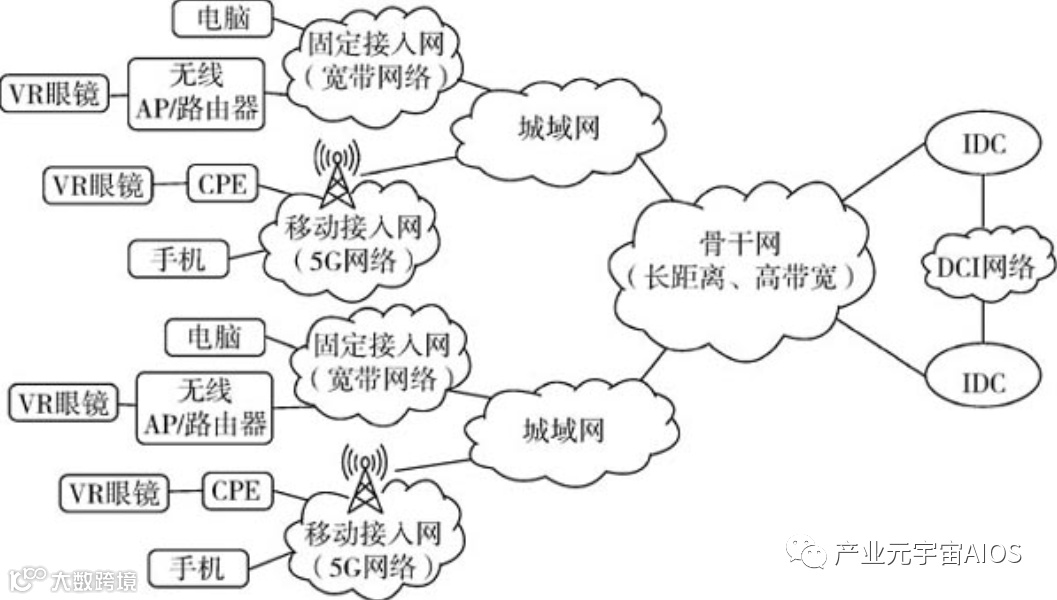 对于元宇宙而言,用户利用终端(手机、电脑乃至脑机接口设备等)通过 5G、Wi-Fi 或者网线连入运营商网络,将其个人相关的数据通过城域网或者骨干网进行传播。