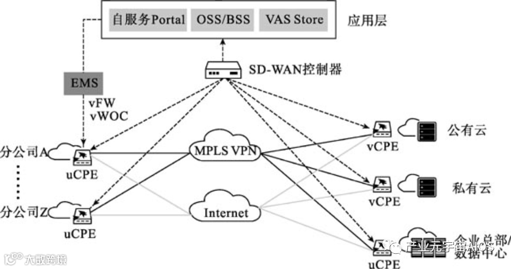 网络通道两端的 CPE 设备在控制器的管控下,利用隧道技术动态、按需地建立承载在专线网络(例如企业 MPLS VPN)或者公共互联网之上的虚拟通道。