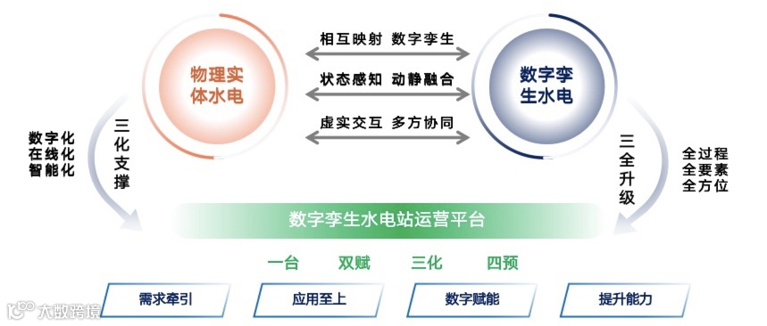 数字孪生水电站运营平台通过数字孪生、物联网、大数据、AI、虚拟仿真等技术,以物理水利为单元、时空数据为底板、水电模型为核心、水电知识为驱动,对水电全要素和水电管理活动全过程进行数字化映射、智慧化模拟,实现与水电站、设备、气象的同步仿真运行、虚实交互、迭代优化,支撑精准化决策。