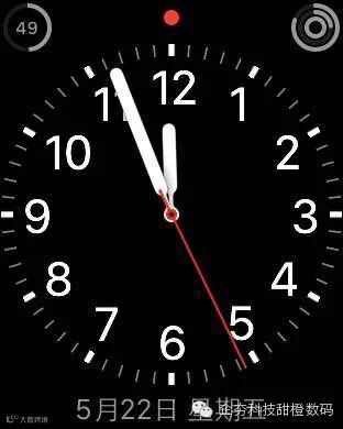 这是一个比大数字表盘还要简洁的表盘,所以它的名字就叫简洁。用户可以对它的 4 个边角和刻度进行自定义,也可以将它设置成只剩下时针、分针和秒针的样式,不过,这样的样式看时间都要经过思索,显然不太方便。一个需要给苹果设计师点赞的细节就是,当时针和分针重合的时候,我们能够在下方的指针上看到上面一根指针的阴影。
