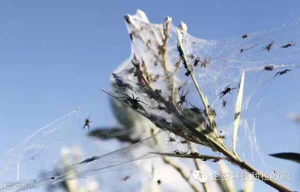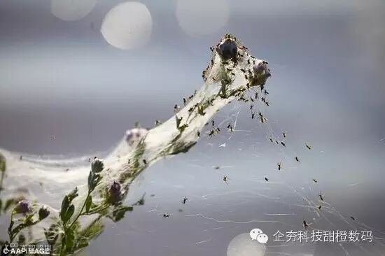蜘蛛们在植物上吐出细丝,和一团团细丝一起乘着微风迁徙。
