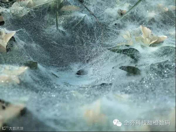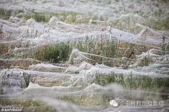 当蛛网一片片落地,遍布整片田野和林地,这种所谓的“天使发丝”现象便诞生了,由于蜘蛛走过的地方总会留下一条丝,如果它们用其他蜘蛛的丝,就会把自己的丝附在上面,最终就会形成很粗的“丝路”。