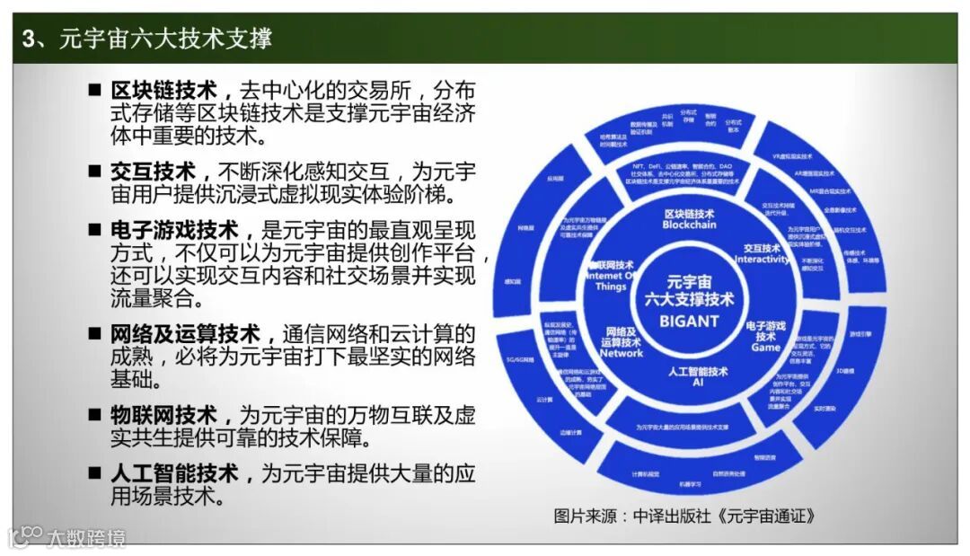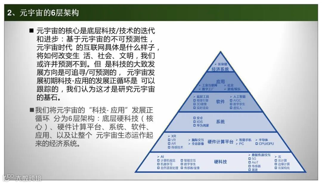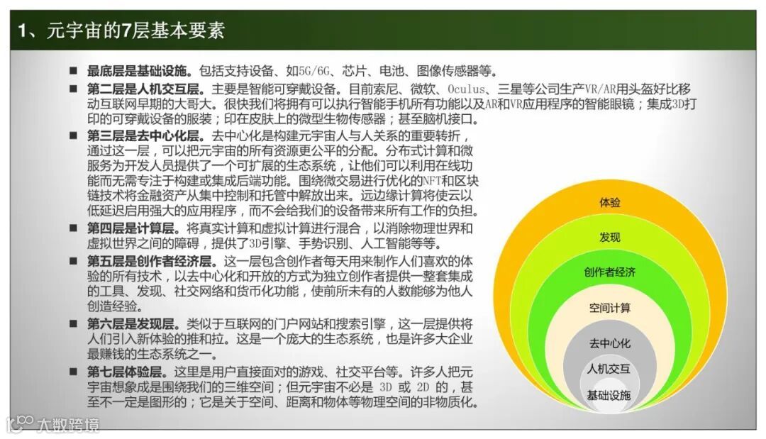 元宇宙的7层基本要素。最底层是基础设施。包括支持设备、如5G/6G、芯片、电池、图像传感器等。
