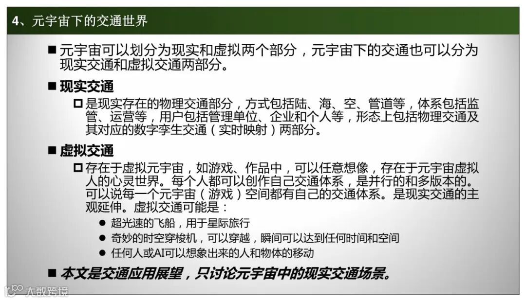 元宇宙可以划分为现实和虚拟两个部分,元宇宙下的交通也可以分为现实交通和虚拟交通两部分。
