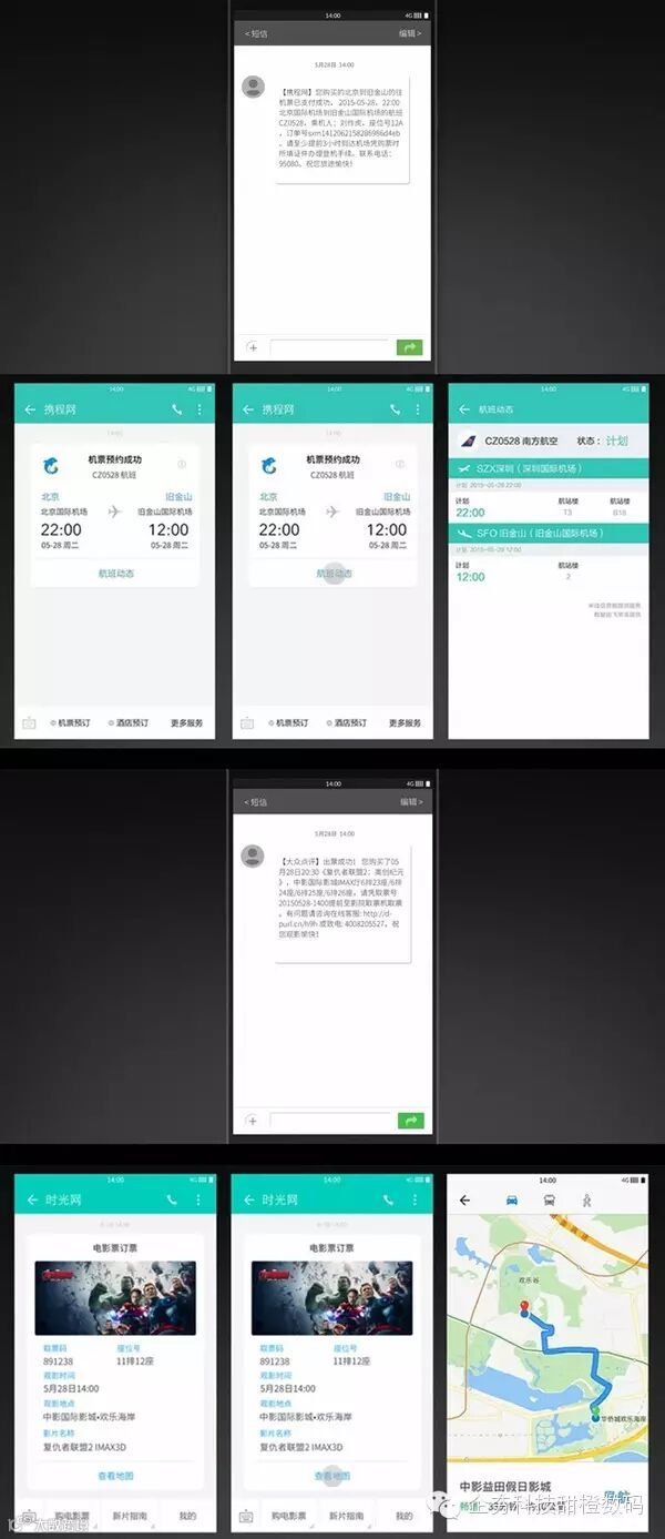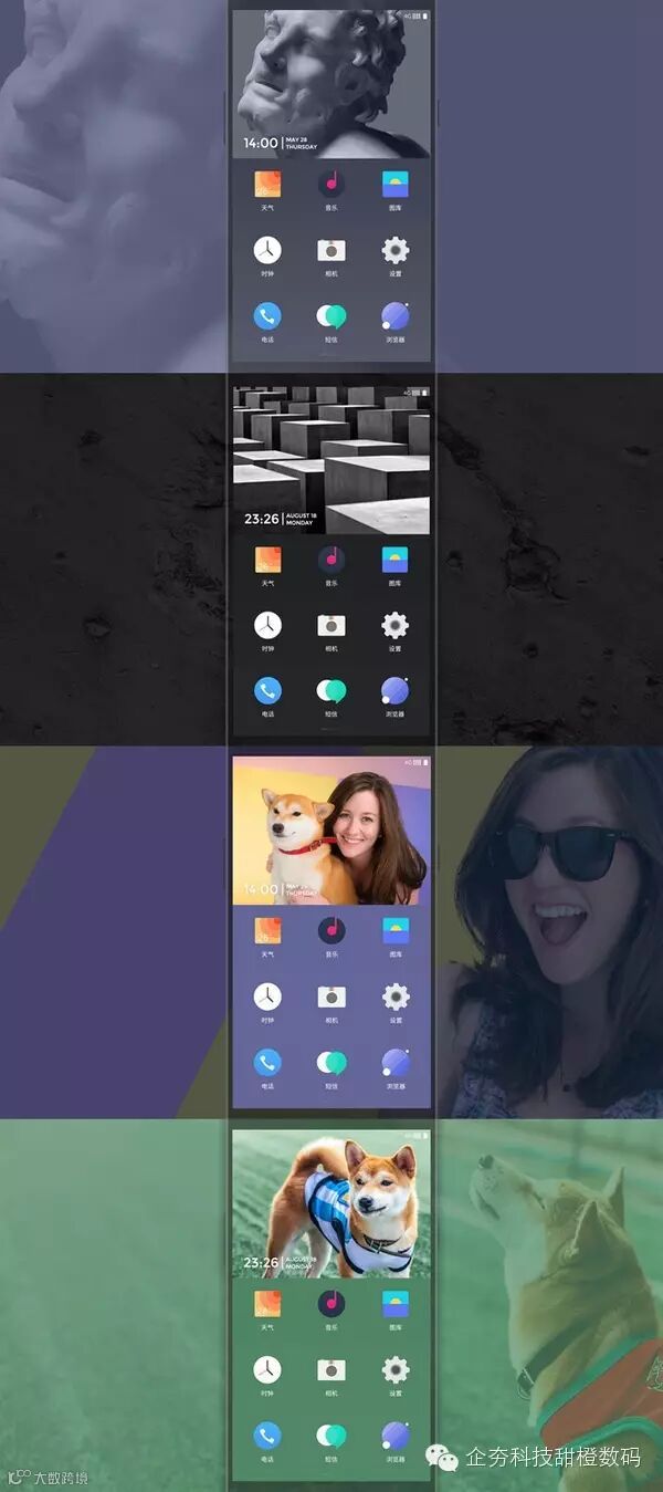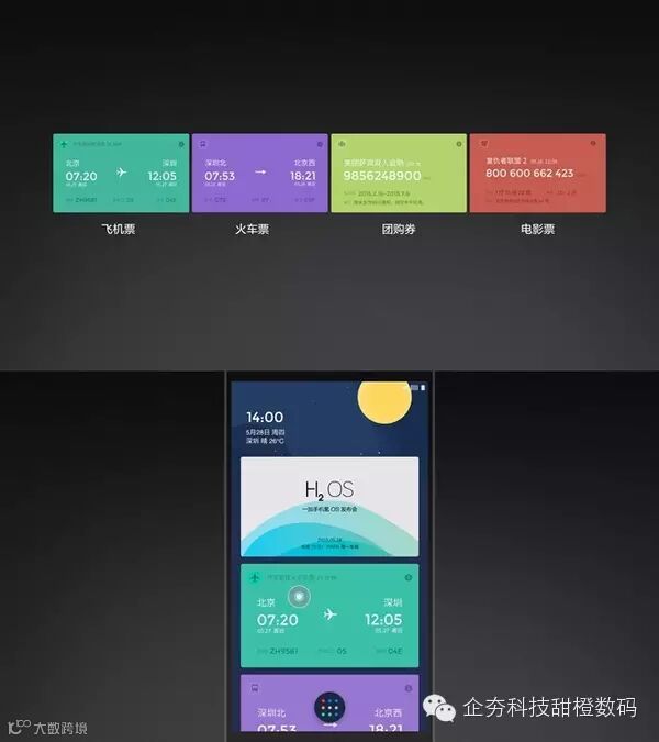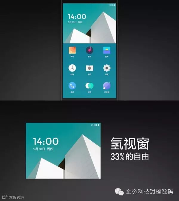在主界面上,氢OS提供“氢视窗”工具,整体由“氢视窗”+9个常用图标构成,号称给用户33%的自由,主题分为两部分,上方是壁纸,下方3×3排列应用;点击进入氢视窗会呈现卡片式整合信息流,信息卡片会根据常用的服务短信进行分类,通过时间排序,以更加直观的方式展现给用户。氢OS系统原生图标将扁平化与拟物化混合,UI由八种主色调和圆形、方形、三角形三个基础图形构成,色彩清新,简单明快。