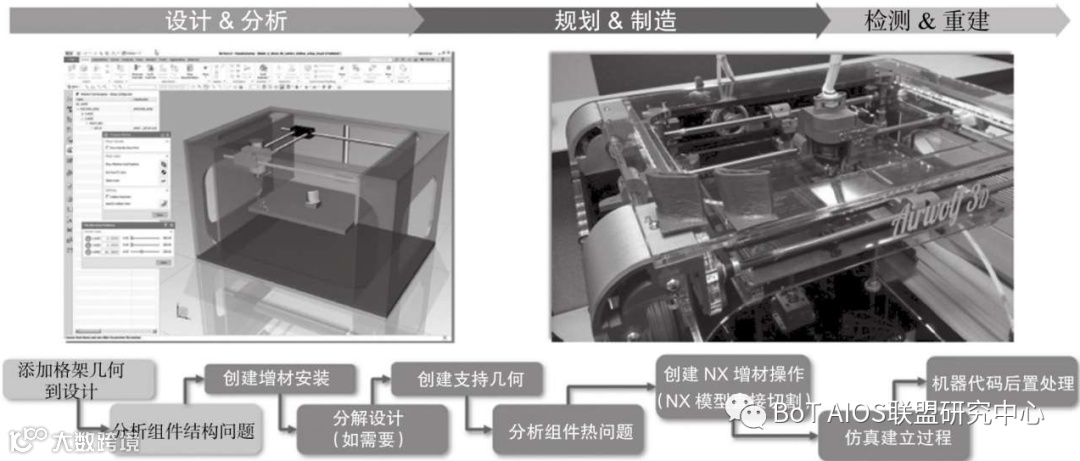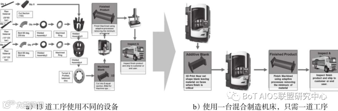 加工一个部件,原来需要13道工序,使用不同设备,在使用一台混合(打印+NC)制造机床后,只需一道工序。并且,所有过程可以使用软件工具进行仿真、验证。