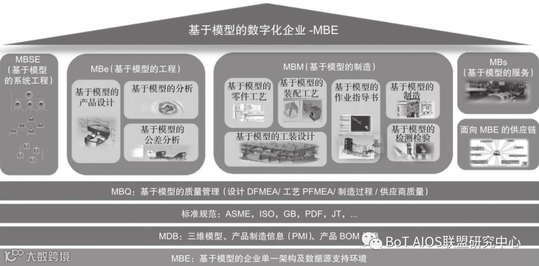 基于模型的企业(MBE)在统一的基于模型的系统工程(MBSE)指导下,通过创建贯穿企业产品整个生命周期的产品模型、流程管理模型、企业(或协作企业间的)产品管理标准规范与决策模型,并在此基础上开展与之相对应的基于模型的工程(MBe)、基于模型的制造(MBM)和基于模型的服务(MBs)的实施部署。