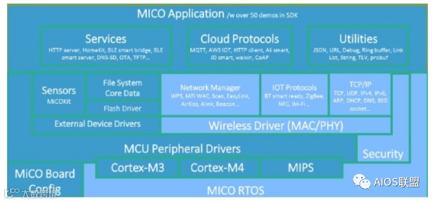 基于微控制器的MICO物联网操作系统不仅仅是一个简单的嵌入式实时操作系统(RTOS),而且还包含了大量中间件或组件,提供互联网接入的支持。