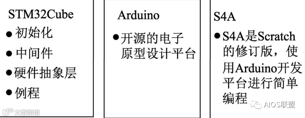 ST公司的STM32Cube软件,让工程师开发越来越简单,开发软件集成了最基础、最基本的功能固件,包括STM32使用的各种中间件或固件,开发者只需要点下鼠标就可以生成需要的工程文件,方便了开发者的开发。Arduino是面向电子爱好者的电子原型平台,降低了开发者的门槛,不需要了解深入的原理和驱动,使用简单的高级语言就可以开发出一些创意的产品。如果说Arduino是面向电子爱好者的话,那么基于Scratch的Arduino编程环境-S4A则是面向青少年的编程工具,其编程更简单,不同层次的开发环境如图: