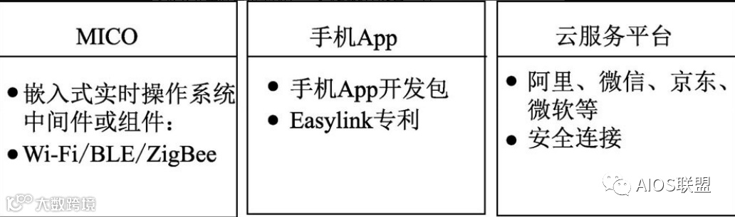 MICO作为独立的系统,拥有开放架构,它并不依赖于微控制器(MCU)型号,同时具有硬件抽象层(HAL)。此外,固件的应用开放接口已实现多种应用层协议:海尔、美的、AO、Apple MFi 、HomeKit、Siri语音控制等。MICO在提供完整智能产品解决方案的基础上,充分利用阿里物联平台稳定可靠的基础架构和服务平台,可快速实现智能产品的云端可靠接入和有效管理。