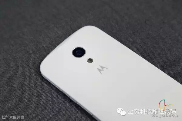 Moto g机身后盖采用弧度设计并且可以拆卸,后盖表面喷有防水涂料,可以起到一定的防泼溅作用。另外,后盖的MOTO Logo也采用了凹陷的设计,意在让用户在握持时把手指放于此处,增加握持舒适度。