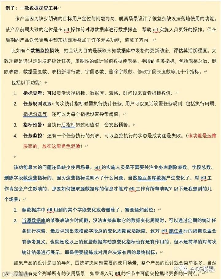 比如有款叫“数据识别”的产品,可以对未知数据库的数据质量、业务属性、数据更新情况进行探查。在立项的时候要明确具体什么角色用户,在什么情况下才会有对目标数据库进行探查的需求。可以初步设定数据仓库开发人员在做ETL开发前需要对源数据库的数据有初步的了解,以帮助他后续ETL开发工作更为顺利的开展。基于这个目的可以去深度挖掘目标用户在这个情景下可能会碰到的问题点是什么,产品需要如何做产能解决问题点。这样才能有针对的做产品设计。