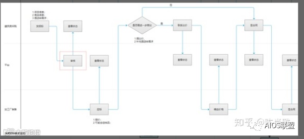 对于一些业务逻辑较复杂的产品,可以通过绘制业务流程图来辅助原型设计,一个业务流程涉及多个角色可考虑泳道图。如下图所示,为玻璃招标购买的泳道图。