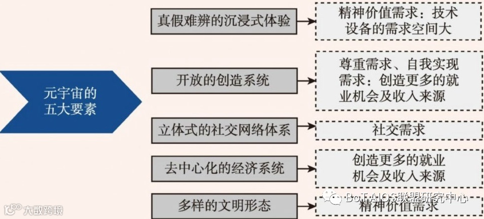 (1)真假难辨的沉浸式体验——满足人的精神价值需求;技术设备的需求空间大,创造更多的收入来源。 (2)开放的创造系统——满足人的尊重需求、自我实现需求;创造更多的就业机会及收入来源。 (3)立体式的社交网络体系——满足人的社交需求。 (4)去中心化的经济系统——创造更多的就业机会及收入来源。 (5)多样的文明形态——满足人的精神价值需求。 |
