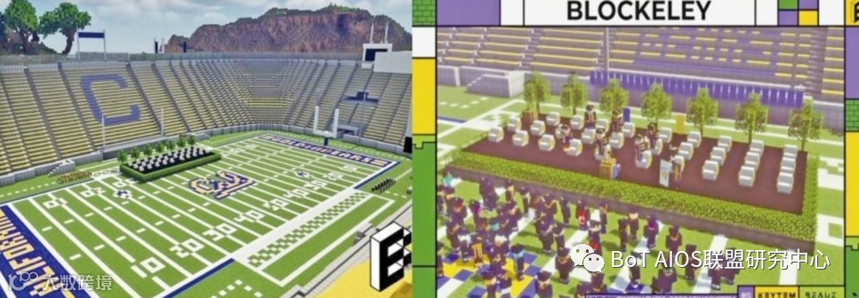 2020年5月,加州大学伯克利分校在《我的世界》(Minecmft)建造了一个模拟的3D伯克利校园,毕业生们在《我的世界》中共同参加了这次虚拟毕业典礼,典礼流程包含了校长致辞、学位授予、拋礼帽等环节。