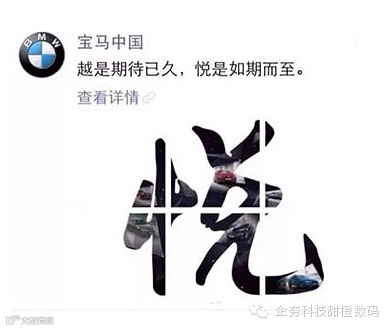 昨天,宝马的广告是用一个大写“悦”字说法作为主呈现方式,再配上了一段广告语“越是期待已久,悦是如期而至。”潜伏在朋友圈的“悦”,是宝马汽车2010年之后推出的品牌战略口号。