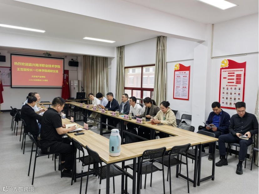 2025年4月24日,嘉兴南洋职业技术学院校长王雪亘一行来访元宇宙产业学院,就虚拟现实专业建设、虚拟现实实训基地建设、产业学院建设等方面进行调研交流。