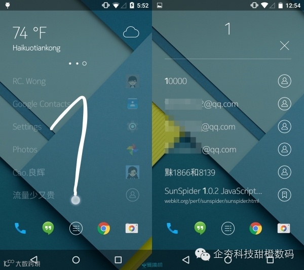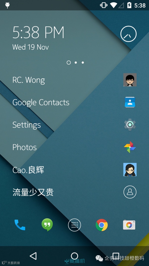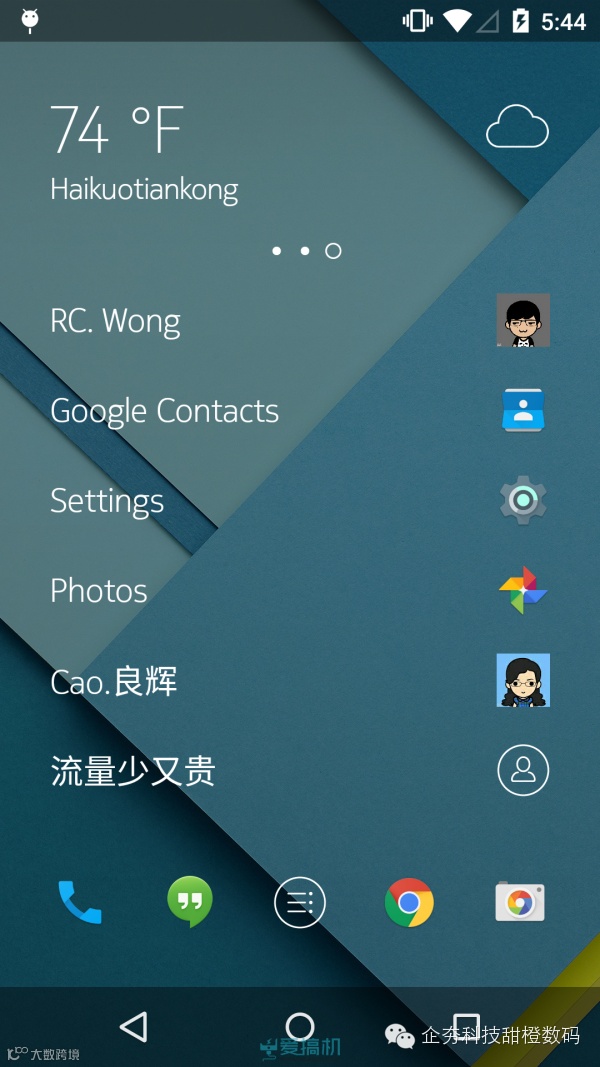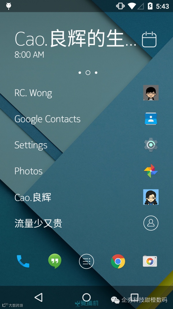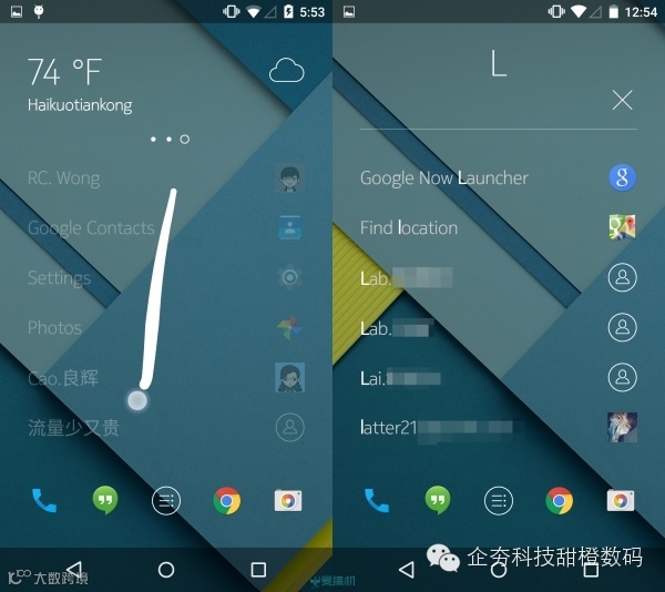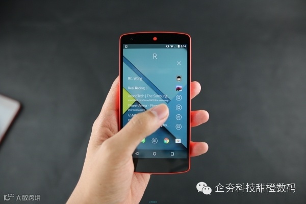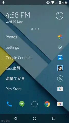 对于Nexus 5这样具有5寸的大屏幕的手机来说,这款启动器非常适合单手操作,因为在正常握姿下,大拇指可以轻松地够到最上方的搜索结果。