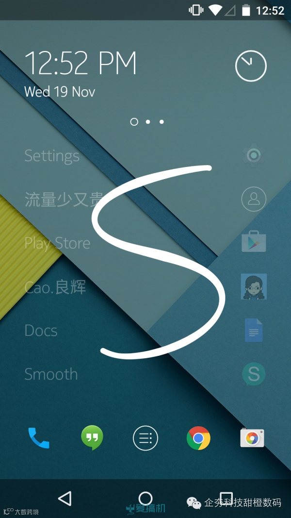 这款Launcher也是有应用抽屉的,只不过列表式的显示对于查找应用实在是不利,也是鼓励用户直接使用手写输入搜索查找应用的做法。