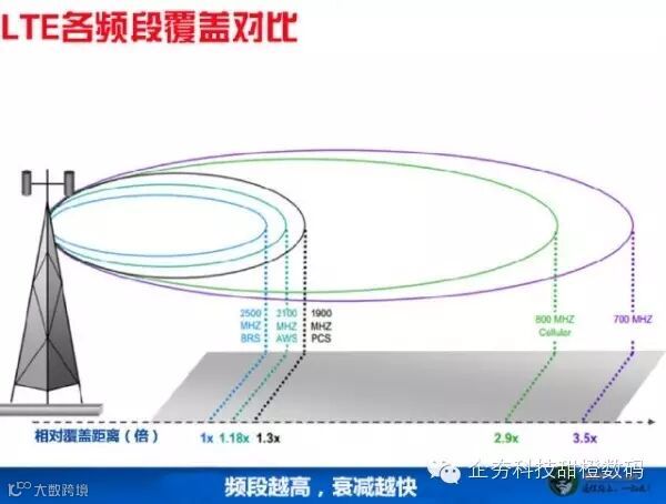 3GPP规定了TDD和FDD两种制式不同的频段,从LTE频谱分配来看,FDD频段普遍较低,TDD频段主要分布在高频段,网络的频谱越高覆盖能力越弱,要想知道频段对网络覆盖的影响有多大,看看下面的图吧!