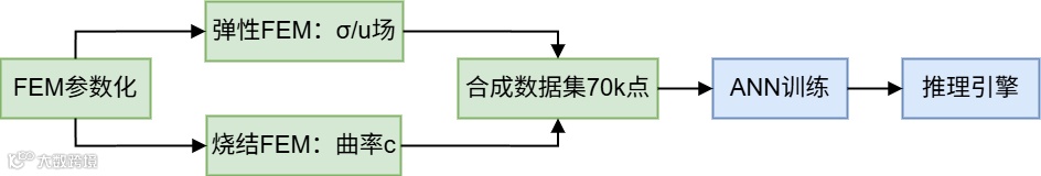 • 创新点1:用廉价弹性FEM(秒级)替代昂贵烧结FEM • 创新点2:引入烧结功( )整合温度/时间效应 • 创新点3:构建参数化数据集(10⁵棒状试样)训练ANN