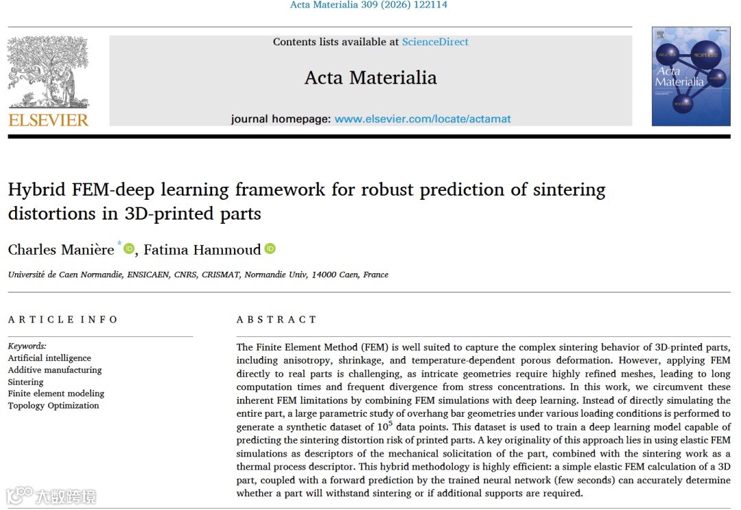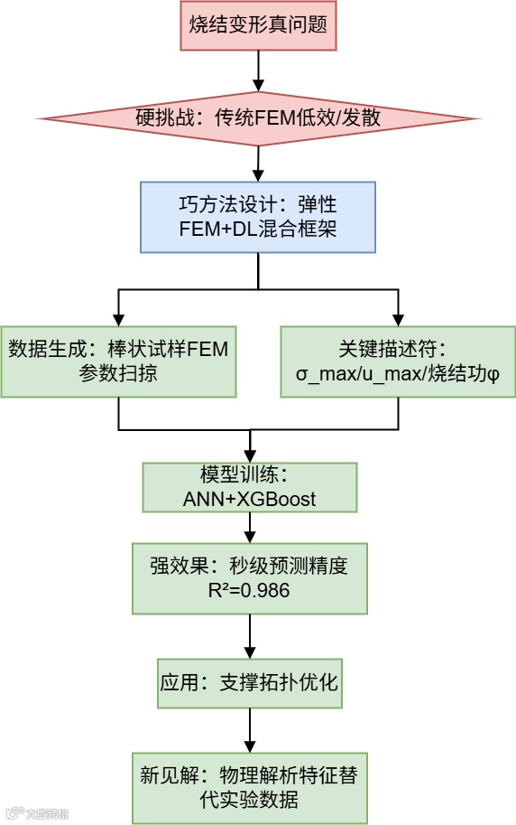 "这篇论文发现了一个关于3D打印烧结变形预测的真问题。该问题的核心硬挑战在于传统FEM模拟复杂几何体时计算效率低且易发散。为攻克此挑战,作者提出了弹性FEM+深度学习的混合框架作为巧方法。该方法取得了秒级精准预测变形风险的强效果,最终凝练出用物理模拟特征替代实验数据的代理建模新见解。"
