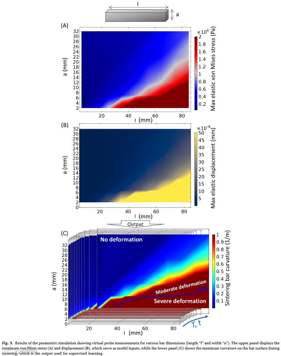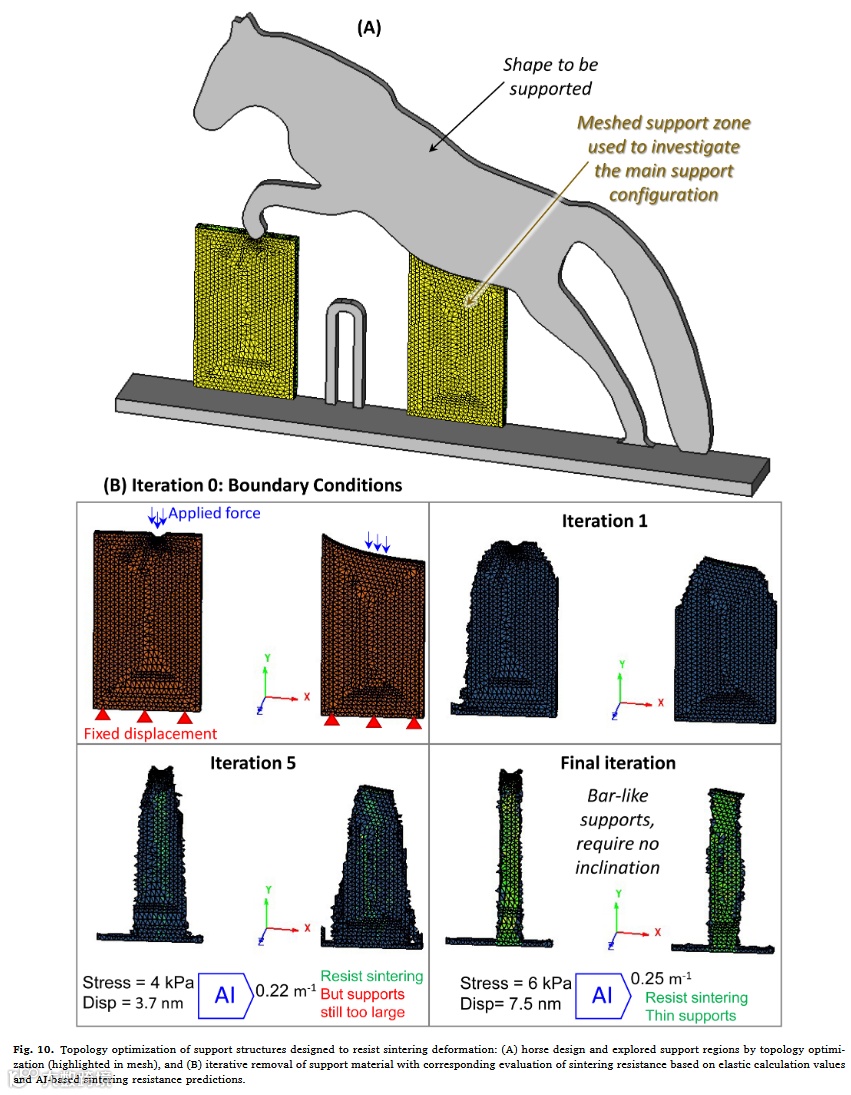 "FEM虽能捕捉3D打印零件复杂烧结行为,但直接模拟真实零件存在计算效率低和发散问题。本研究通过结合弹性FEM与深度学习,对悬垂棒状体进行参数化研究生成合成数据集(10⁵点)。核心创新在于用弹性FEM作力学描述符,烧结功作热过程描述符。该混合方法仅需数秒即可预测零件烧结耐受性。"