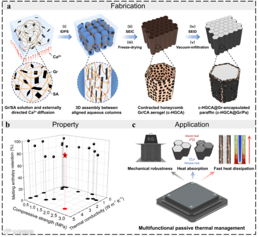 针对上述挑战,北京科技大学张海龙教授团队提出了一种仿生蜂窝结构工程策略,成功实现了气凝胶封装相变复合材料中机械性能与热导性能的协同提升。该团队通过离子单向扩散诱导相分离(Ion-Diffusion-Induced Phase Separation,IDPS)机制构筑了石墨烯/海藻酸钙蜂窝气凝胶骨架,并在此基础上发展出“双网络解耦设计”,即通过蜂窝结构承担机械载荷,同时通过石墨烯网络构建连续导热通道,从而突破传统材料中的性能耦合限制。具体而言,在材料制备过程中,Ca²⁺离子从溶液界面单向扩散进入海藻酸钠溶液,引发界面快速交联并诱导各向异性相分离。在这一过程中,体系首先形成富水相囊泡结构,随后在持续的离子扩散与表面张力作用下,囊泡逐渐转变为紧密排列的水柱阵列。水柱之间的挤压作用将海藻酸钙凝胶与石墨烯纳米片排挤到柱间区域,最终形成具有六边形蜂窝拓扑结构的凝胶网络;界面张力进一步在柱壁处形成类似泡沫Plateau边界的稳定结构,从而构建长程有序的蜂窝骨架。经冷冻干燥后,该结构被完整保留下来,形成石墨烯/海藻酸钙蜂窝气凝胶,其中海藻酸钙交联网络构成高强度承载骨架,而石墨烯纳米片则以“砖–砂浆(brick-and-mortar)”形式嵌入蜂窝壁中。随后,研究团队通过溶剂蒸发诱导收缩(SEIC)过程提高骨架密度,使气凝胶在20%应变下的比强度达到19.2 kN·m·kg⁻¹,并通过溶剂蒸发诱导沉积(SEID)方法在蜂窝壁表面沉积连续石墨烯层,建立高效导热网络。当石蜡相变材料被真空浸渗进入蜂窝孔道后,形成的复合材料同时表现出优异的热学与力学性能:材料热导率达到4.18 W·m⁻¹·K⁻¹,较纯相变材料提升超过15倍,同时在相变后仍保持2.49 MPa的压缩强度,并实现83.9 wt%的相变材料负载量和199.0 J·g⁻¹的高熔化焓。其物理机制在于:蜂窝结构中的垂直通道既充当液态PCM的容纳空间,又作为承载柱抵抗外部压缩载荷,而蜂窝壁上的连续石墨烯网络则形成贯通的热传导路径,使热量能够快速从热源沿骨架传递并在PCM中均匀扩散。实验表明,该复合材料在CPU散热测试中可将芯片峰值温度降低约10.2 °C,显著提升电子器件的热稳定性。该研究通过结构仿生与多尺度网络设计,实现了机械支撑、快速导热和高效储热三种功能的协同集成,为极端热机械环境下电子器件被动热管理材料的设计提供了一种新的结构工程策略。相关内容发表于《Advanced Materials》上。(张琰炯)