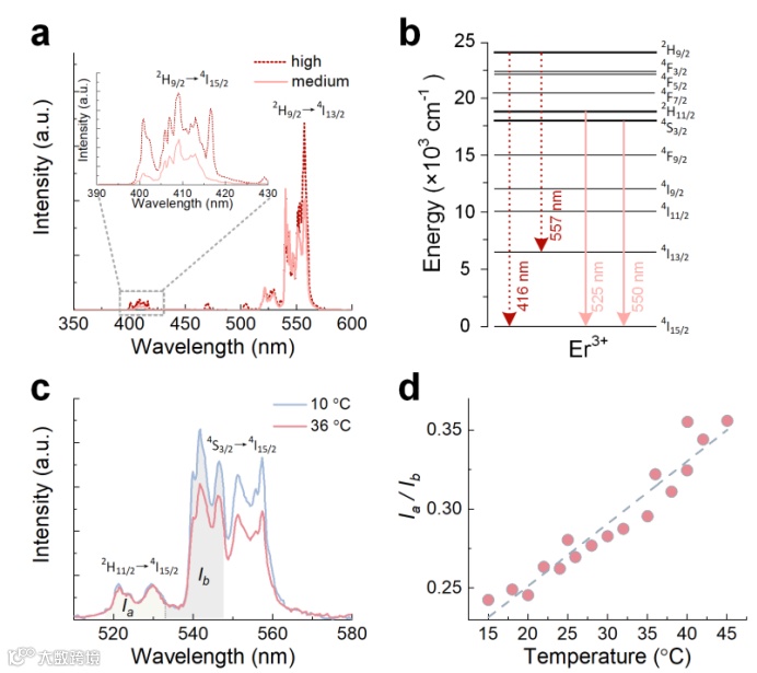上转换发光中,热耦合能级之间的发射强度比对温度高度敏感。研究者系统测量了不同温度下的光谱变化,并建立了定量的温度标定关系。这一结果使单颗粒、非接触式的纳米测温成为可能。