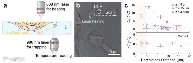 图6:基于单个上转换微颗粒的细胞外温度探测结果