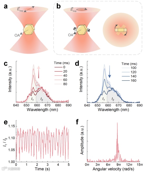 通过调控捕获光的偏振态,实现了对上转换微粒的可控光致旋转。粒子旋转过程中,其发光光谱呈现周期性变化。通过频域分析这些光谱波动,即可直接获得粒子的旋转速度,并进一步检测周围介质的粘度。