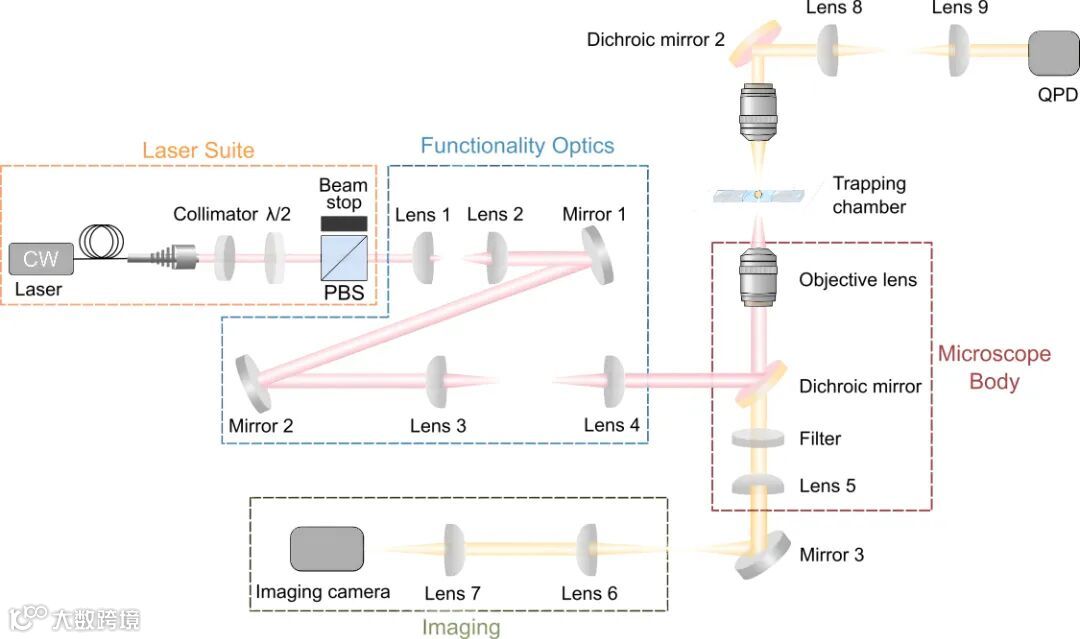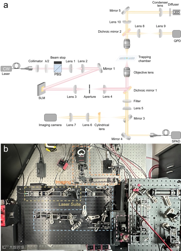 研究者首先搭建了一套稳定、可复现的单梯度光镊系统。该系统集成了激光调控、偏振控制、粒子捕获与荧光检测模块,为后续所有纳米尺度操控与定量测量提供了统一、可靠的实验平台。