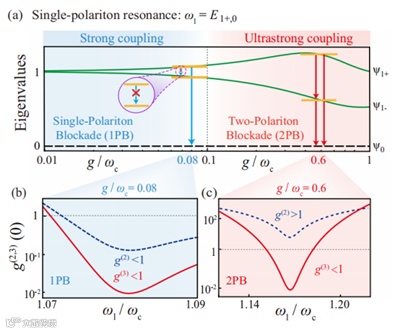 在强耦合体系中,一个典型的非线性效应是单极化激元阻塞:由于能级结构的非简谐性,单个极化激元的存在会抑制第二个极化激元的激发,这一效应对单粒子源构建与量子信息处理具有重要意义。然而,近年来研究发现,在USC体系中,尽管能级的非简谐性有所增强,反旋项所引入的多粒子跃迁通道却会在单极化激元共振激发条件下削弱传统意义上的阻塞效应,甚至使其转变为光子聚束行为(Phys. Rev. Lett. 109, 193602 (2012))。这一现象引出了一个根本性的科学问题:当单极化激元阻塞在USC体系中失效时,是否会有其他新型的、增强的量子效应浮现出来?目前,关于多极化激元阻塞,特别是双极化激元阻塞在USC中的行为,仍属一个鲜有涉足的研究领域,其背后的物理机制尚待进一步揭示。